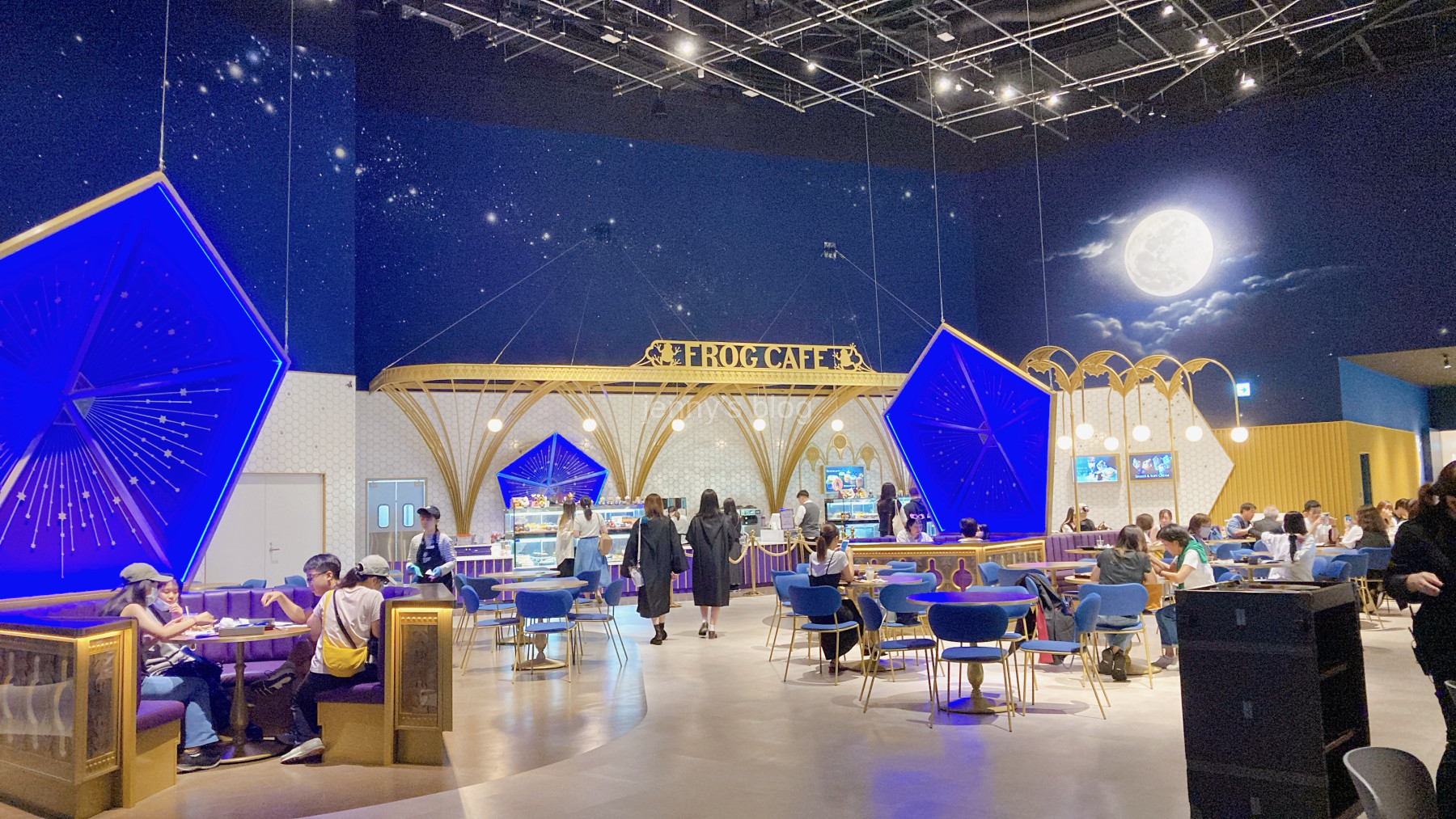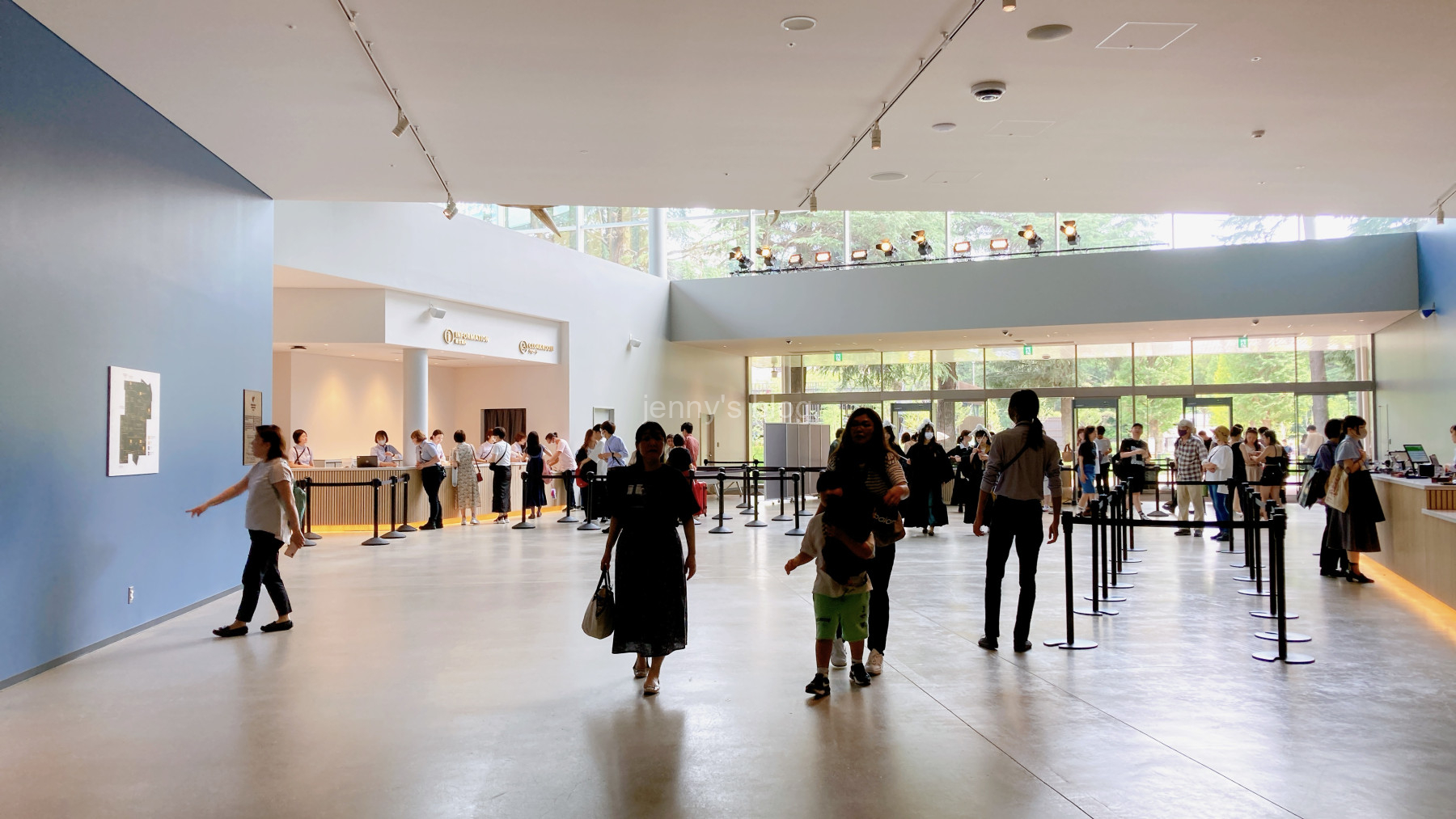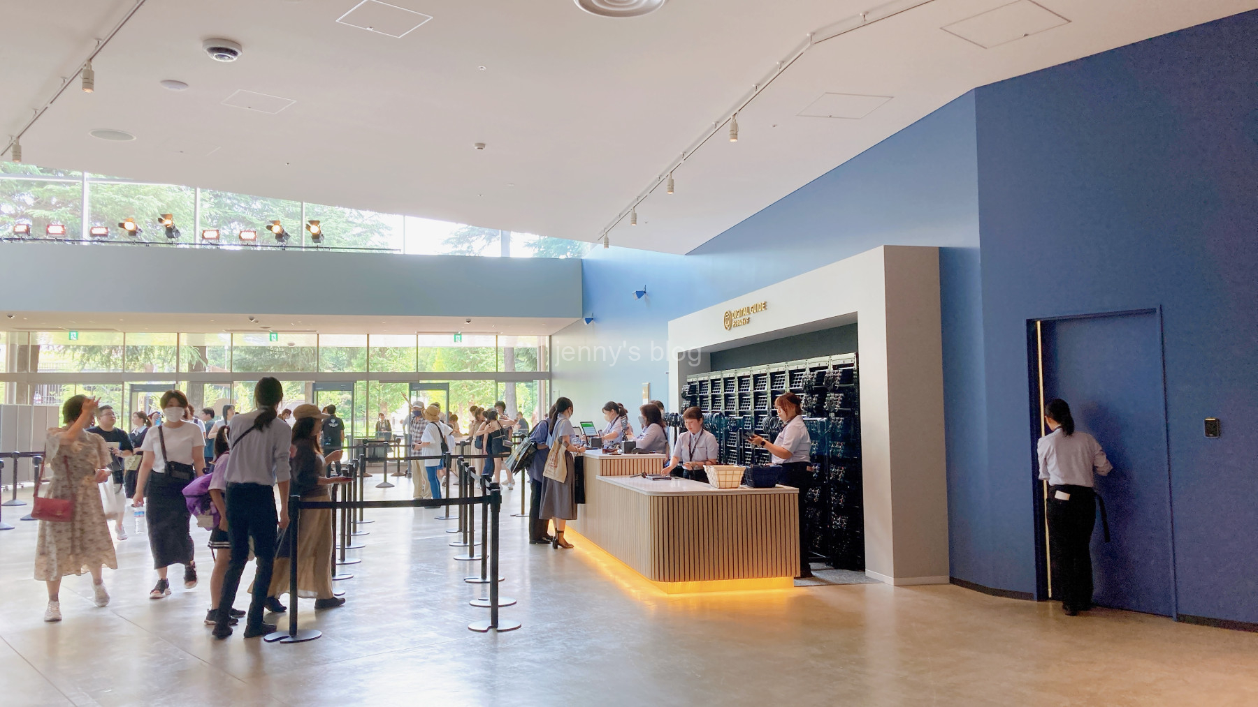 入ってすぐのところには荷物が受け取れるクローク、そしてオーディオガイドの受け取り場所があり、少し進むとフードホールやフロッグカフェ、グッズ売り場があります。